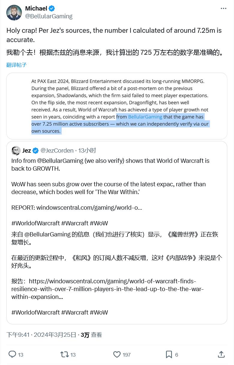 BellularGaming 分析预估目前《魔兽世界》游戏活跃玩家数量达到 725 万,IT 之家附上截图如下:
