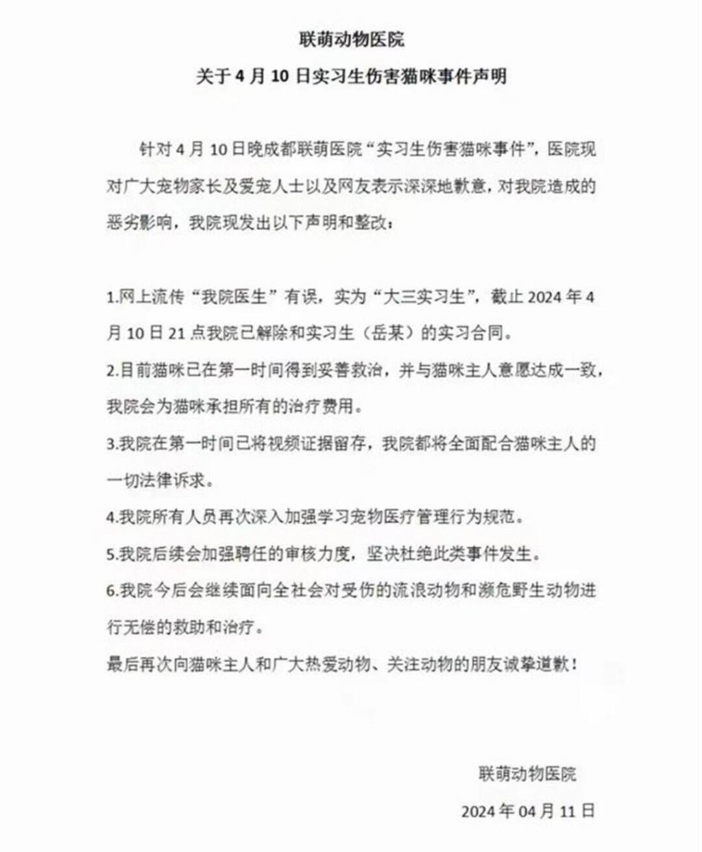 4 月 11 日,联萌动物医院在网上发布声明,称虐猫者为到该医院实习的 " 大三实习生 ",现医院已和其解除实习合同。目前,医院已和猫主人意愿达成一致,将承担猫咪所有治疗费用,同时将留存视频证据,配合猫主人一切法律诉求。