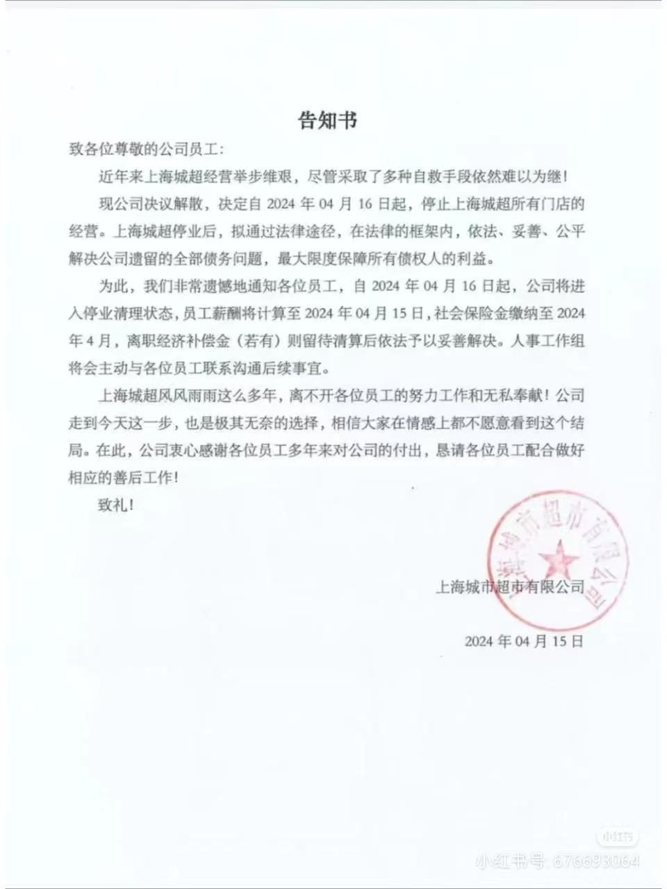 4 月 15 日,上海城市超市(以下简称:上海城超)发布告知书称,近年来,上海城市超市经营举步维艰,尽管采取了多种自救手段依然难以为继,现公司决议解散,决定从 4 月 16 日起停止上海城市超市所有门店的经营。