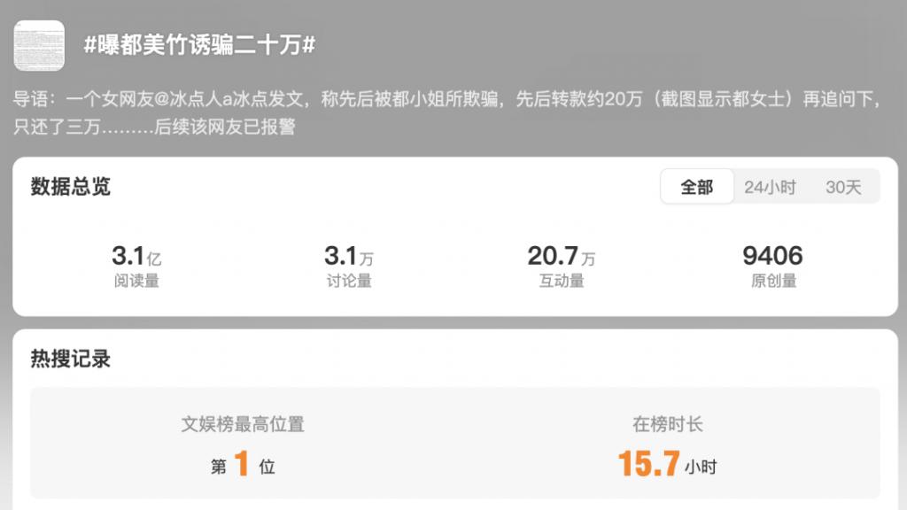 近日,词条 # 曝都美竹诱骗二十万 # 冲上热搜第一的位置,到目前 10 几个小时阅读量达到了 3.1 亿!