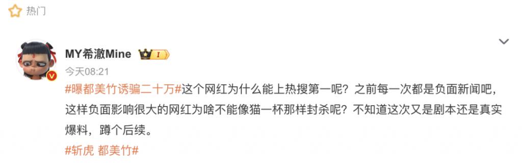 2024 年 4 月 15 日,有网友在社交平台发文,称曾是都女士的支持者,经常留言鼓励对方。都美竹以抑郁、上学、打官司等理由,多次以 " 借钱 " 名义向粉丝要钱,并承诺有钱就还,秉承着对都女士的信任,该网友在两个 wx 中前后共计转账接近二十万元,之后她拿着这 20 万买奢侈品、外出旅行。