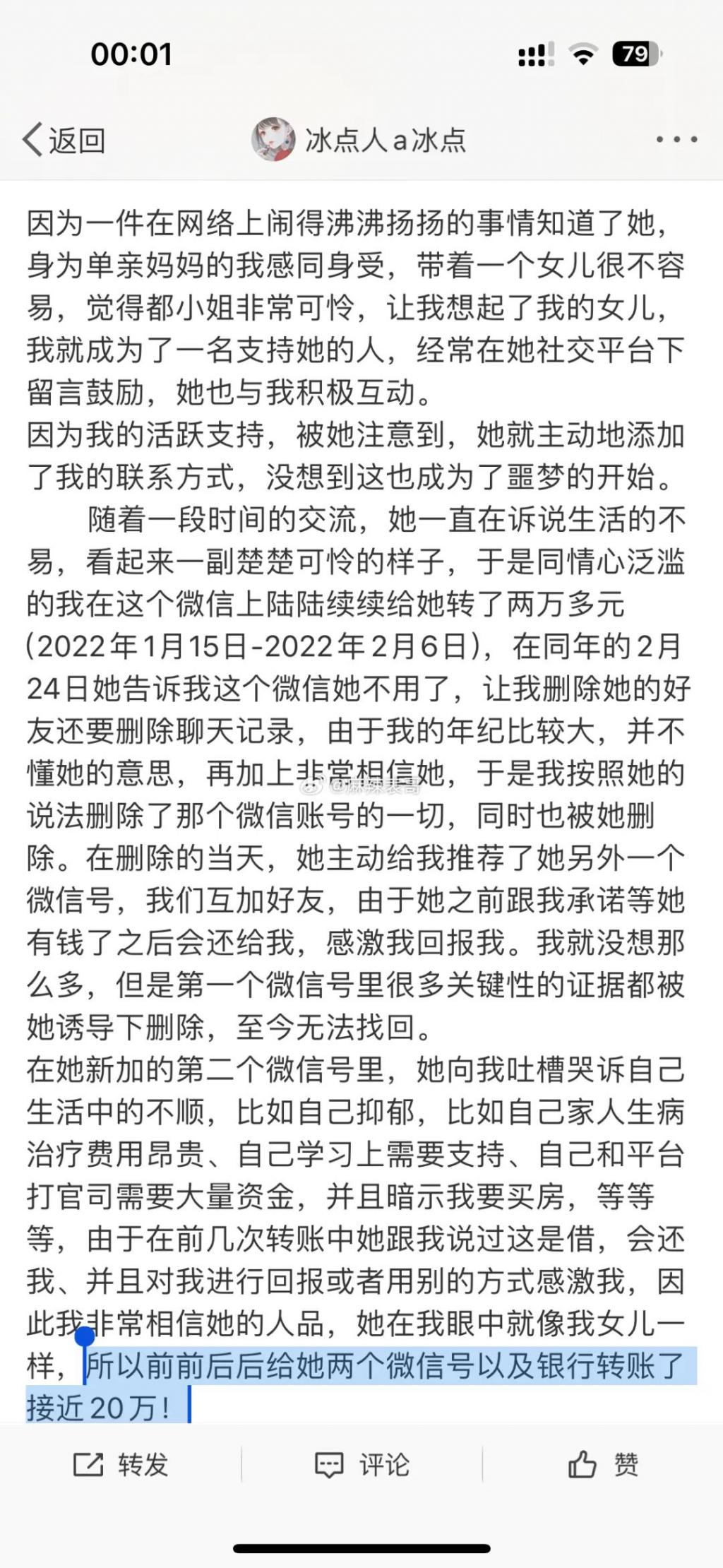 该网友在 2023 年底急需要用钱,想让对方还钱,结果都女士只归还 3 万,还把网友踢出了粉丝群,并嚣张表示粉丝告她也不怕,律师说她不用还钱。