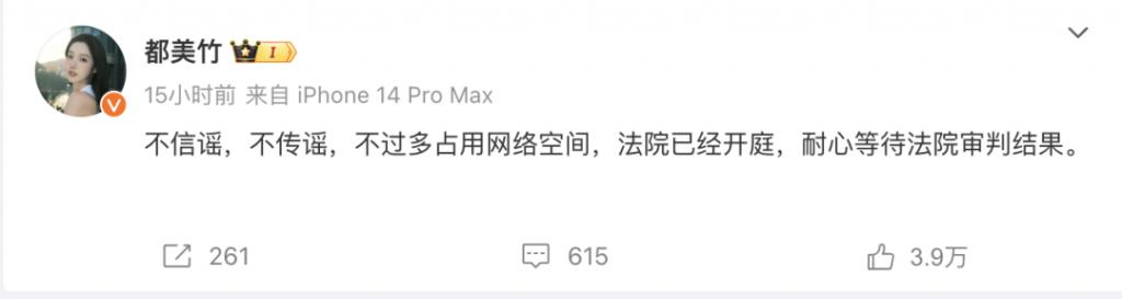 2024 年 4 月 15 日晚上,都美竹针对诱骗二十万事件发帖子称:不信谣,不传谣,不过多占用网络空间,法院已经开庭,耐心等待法院审判结果。