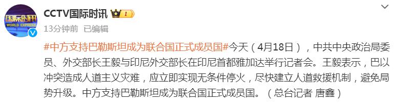 今天(4 月 18 日),中共中央政治局委员、外交部长王毅与印尼外交部长在印尼首都雅加达举行记者会。王毅表示,巴以冲突造成人道主义灾难,应立即实现无条件停火,尽快建立人道救援机制,避免局势升级。中方支持巴勒斯坦成为联合国正式成员国。