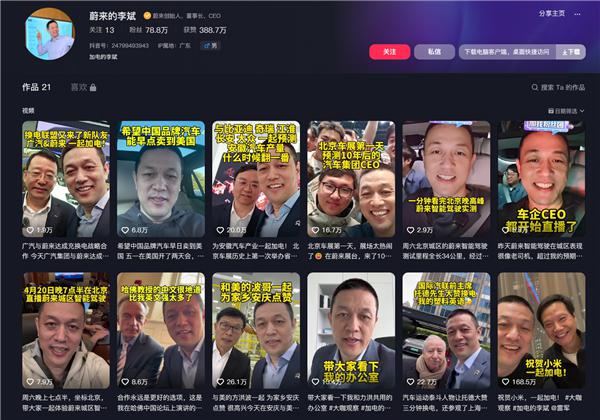 而且,自上次直播后,李斌又发布了 13 条视频,单条视频平均点赞量超过 10 万,粉丝量也增加到了 78.8 万,李斌已成为蔚来汽车内部,第一个车圈大 V,蔚来也一同得到了流量的嘉奖。