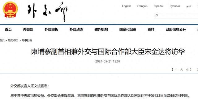 应中共中央政治局委员、外交部长王毅邀请,柬埔寨副首相兼外交与国际合作部大臣宋金达将于 5 月 23 日至 25 日访问中国。