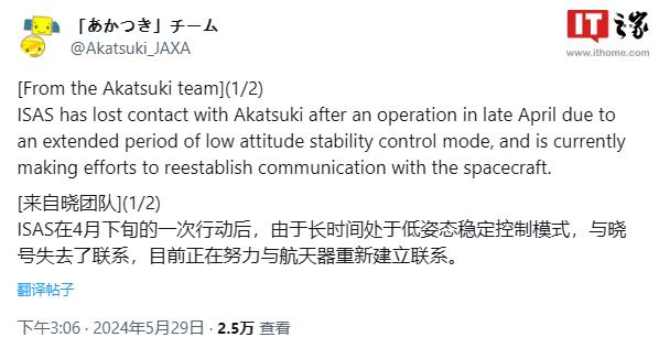 JAXA 宇宙航空研究所在一份更新中表示,由于探测器长时间处于姿态控制能力不足的状态," 晓 " 号 在今年 4 月底的一次操作后失去了联系。不过目前尚未完全失去希望,JAXA 正在努力重新与探测器建立通信。