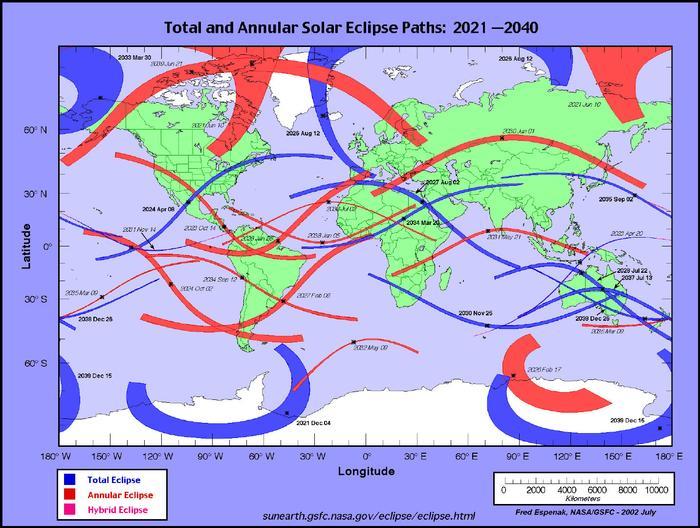 图三罗列了2021年至2040年日全食和日环食的时间和路径,