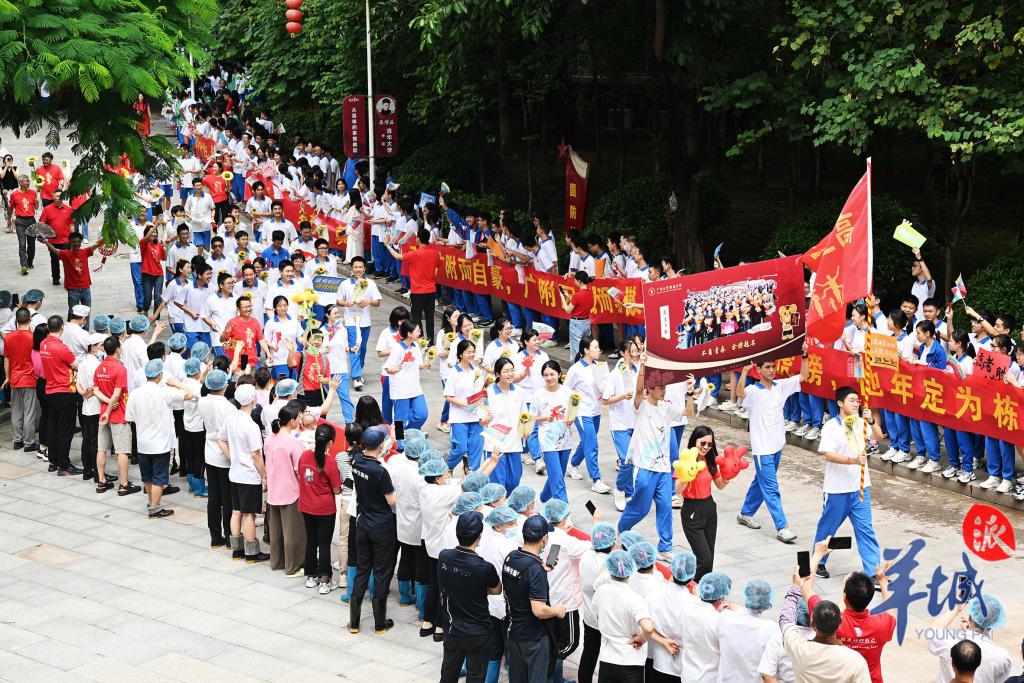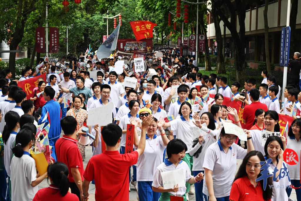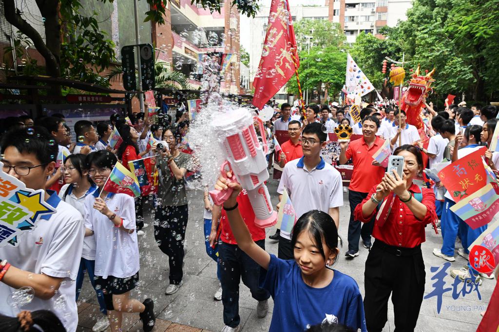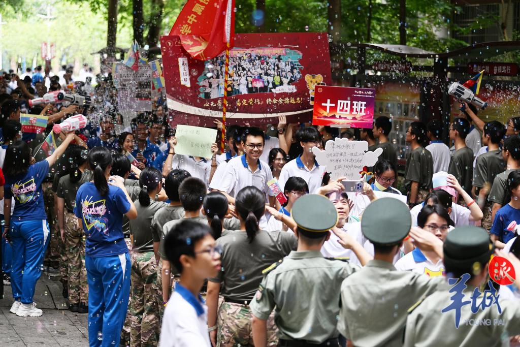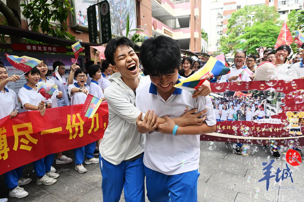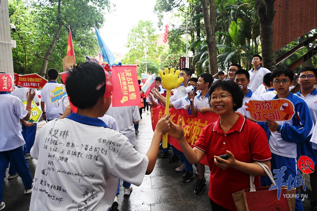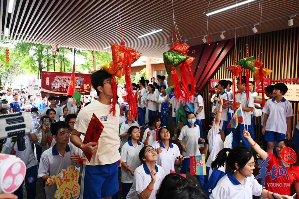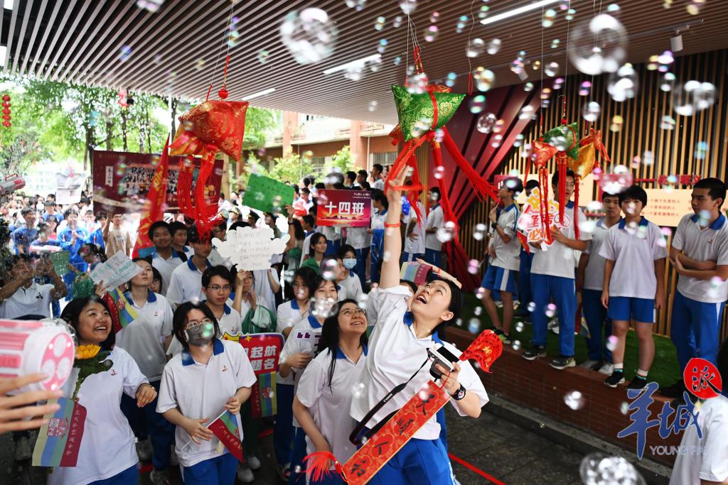 龙腾虎跃、锣鼓喧天,在漫天五彩泡泡中跨过 " 高考夺魁 " 门、一跃而起跳高摸粽子寓意 " 一举高中 " ……高考临近,广州大学附属中学(以下简称 " 广大附中 ")利用 6 月 6 日上午大课间的时间,为本校 2024 届高三学子举行了简短而热烈的送考仪式。