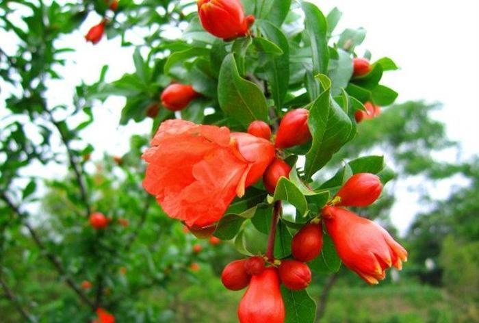 六月石榴花神江淹江淹写《石榴颂》云:"美木艳树,谁望谁待?……照烈泉石,芳披山海。奇丽不移,霜雪空改。"石榴"千房同膜,十子如一",成熟后微微绽开一点红唇儿,笑向人间,所以人们常以石榴作礼品,祝其子孙发达、前程无量。