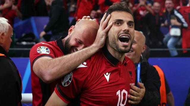 6 月 15 日,阿尔巴尼亚队球员巴伊拉米(右)庆祝进球。图片来自欧足联官网因为有西班牙、克罗地亚和意大利队,B 组被称为 " 死亡之组 "。意大利队与该组实力最弱的阿尔巴尼亚队的较量原本被认为没有任何悬念,未曾想意大利队球员迪马尔科掷界外球失误,巴伊拉米近角爆射破门,此时比赛刚刚开始 23 秒,创造了欧锦赛最快进球纪录。