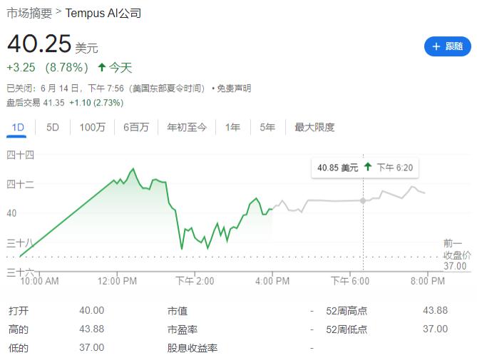 在周五上市首日,Tempus AI 的股价表现强劲,一度飙升 15%,最终收盘时市值达到约 66.5 亿美元,较发行价上涨近 9%。公司周四以每股 37 美元的价格成功发行了 1110 万股,筹集资金约 4.1 亿美元。