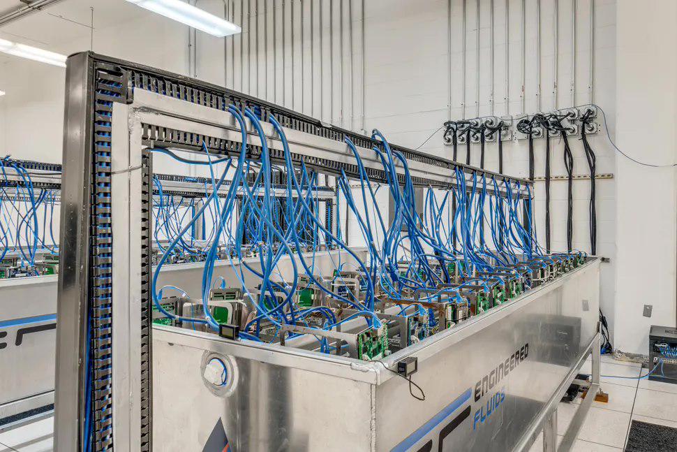 购房者将获得房子里面所有的制冷和电力基础设施,其中包括三个单相液体浸没式冷却槽 Engineered Fluids"SLICTanks"(用于电介质冷却液),同时还带有水泵和一个 500 千瓦干式冷却器。从照片上可以看到,这些冷却槽目前至少容纳了 80 台挖矿计算机,不过还可以根据需要配置更多机器,冷却装置附近还摆放着一排经典服务器机架和大量的网络设备。