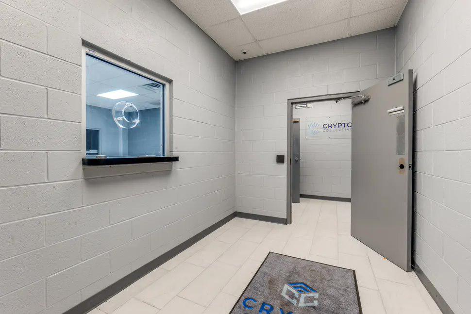 走进房子内部,映入眼帘的是一个白色砖砌走廊和一个玻璃隔板接待台,整个空间更像是仓库风格的办公室。此外,房子上的 "Crypto Collective" 品牌标识暗示了它过去的身份 —— 一个比特币挖矿基地。