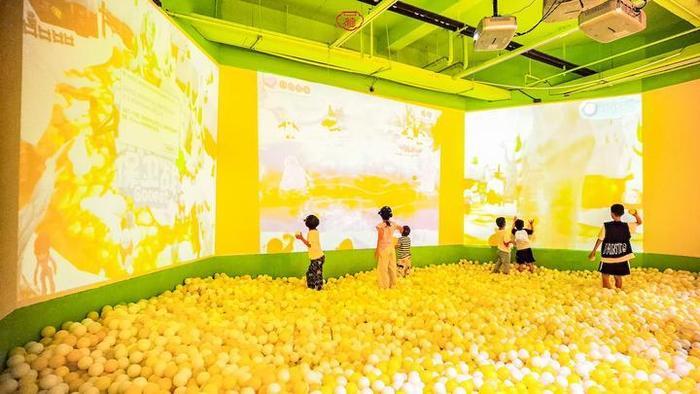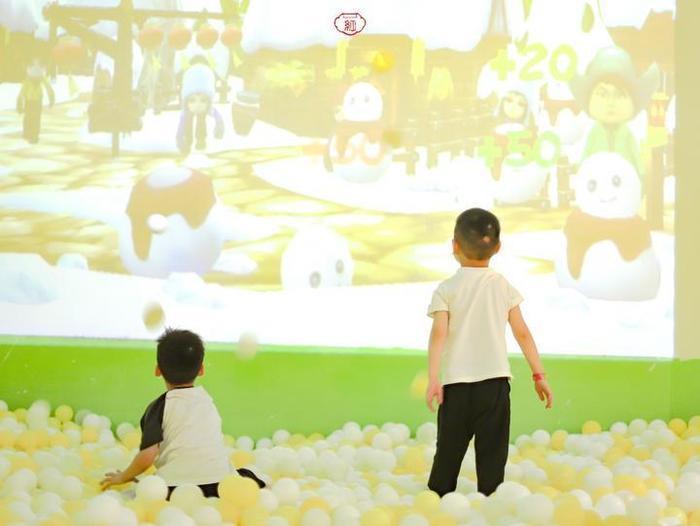 二楼是超解压的淘气堡,这里有一眼望不到头的海洋球池,里面错落有致的分布了各种小滑梯、攀爬网、吊床和光影魔法球。