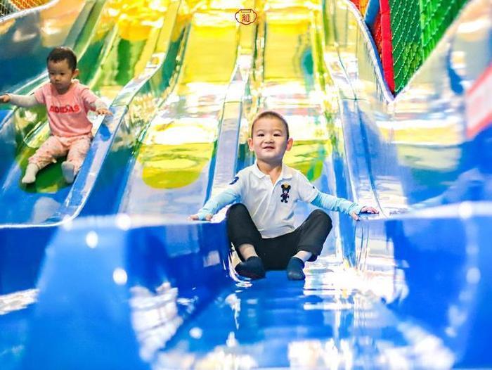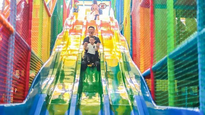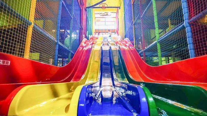重点在滑梯乐园,这是宝燕乐园的标志性网红项目,共有13条不同坡度的彩虹滑道,其中45°左右的蓝色海洋球滑梯和90°左右的红色垂直滑梯最受孩子的追捧,从高7.3米的高空滑到地面只需4秒钟。