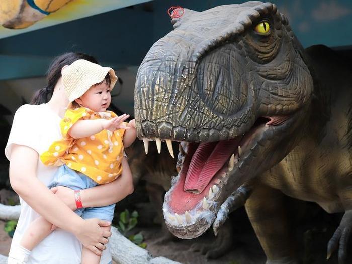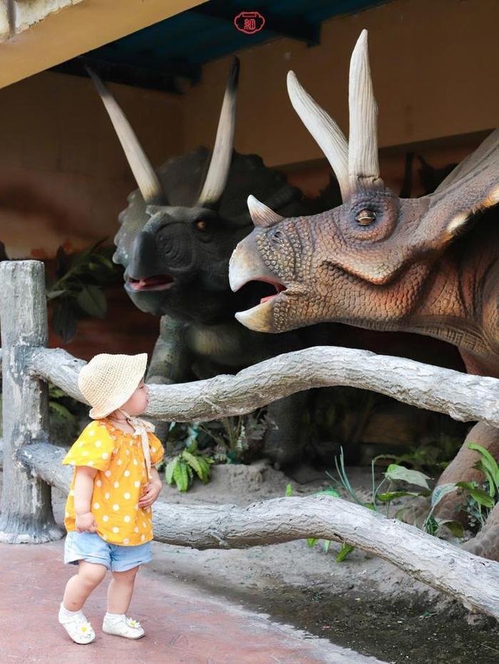 玩完水换好衣服,我们就上五楼露天打个卡,天气太热,室外温度很高,宝宝们其实并不太想多逗留,但两个小家伙都被这组恐龙吸引了,他们好奇的去触摸,去感知,不仅儿子喜欢,女儿也毫不畏惧,将来等他们都长大了,看来是都要喜欢奥特曼了吧。