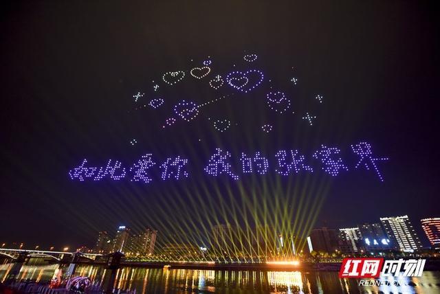 夜幕降临,华灯初上,大庸古城灯火辉煌、热闹非凡,一盏盏花灯交相辉映、流光溢彩。从澧水河中央开始,天门山、七星山、七十二奇楼、土家风情园及全城灯展依次点亮,千架无人机随后在澧水上空腾空而起,以夜空为画布,以灯光为画笔,点亮城市夜空,主舞台现场万人唱响《龙的传人》,水上码头12支舞龙队伍惊艳登场,“水、陆、空”演绎光影梦幻,绘就出一幅“火树银花不夜天”的城市美景,让人如痴如醉。