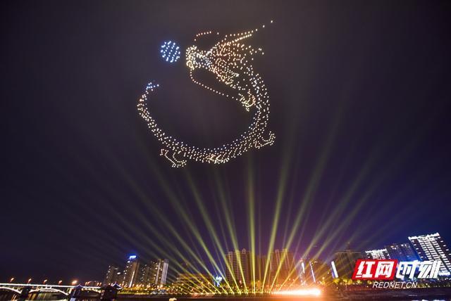 千架无人机在澧水上空腾空而起,以夜空为画布,以灯光为画笔,点亮城市夜空。(张潘 摄)
