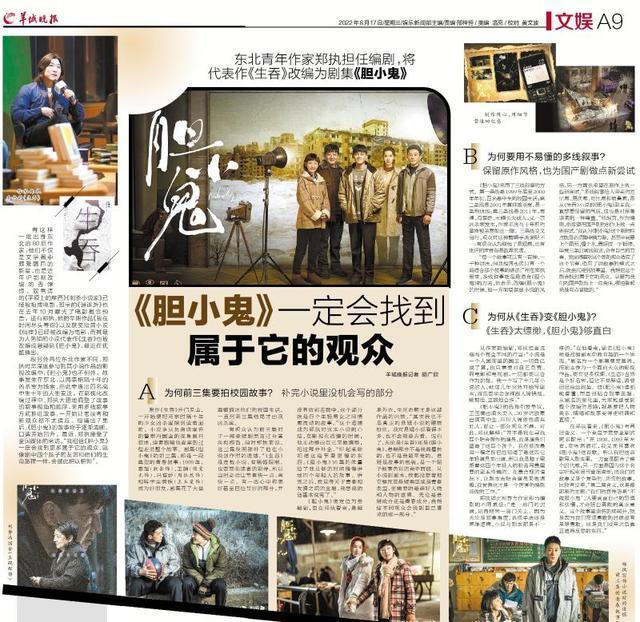 “每一个故事可以有一百种、一千种讲法,但我相信永远只有一个最适合那个故事的讲法。”而在郑执看来,多线叙事就是最适合《胆小鬼》的方法,他表示,改编《胆小鬼》的时候,他一方面要保留小说的风格,另一方面也希望在剧作上做一些新尝试。“多线叙事给人带来的回忆感、层次感、对比感和堆叠感,是从《生吞》小说到《胆小鬼》剧本我一直想要保留的气质,这也是对原著读者的一种尊重。”他坦言,作为编剧,他希望在国产剧的创作上做一点新尝试。“我认为《胆小鬼》这个剧的特点就是必须集中精力看。甚至中间要上个厕所、喝个水,最好按一下暂停。毕竟三条时间线叙述,会有自己的节奏。我觉得喜欢这个剧的观众适应了这个节奏、适应了讲故事的模式之后,就会沉浸到故事里。我相信这个剧会找到属于它的观众。总要为我们的国产剧负上一些责任,哪怕看起来是有点冒险的。”