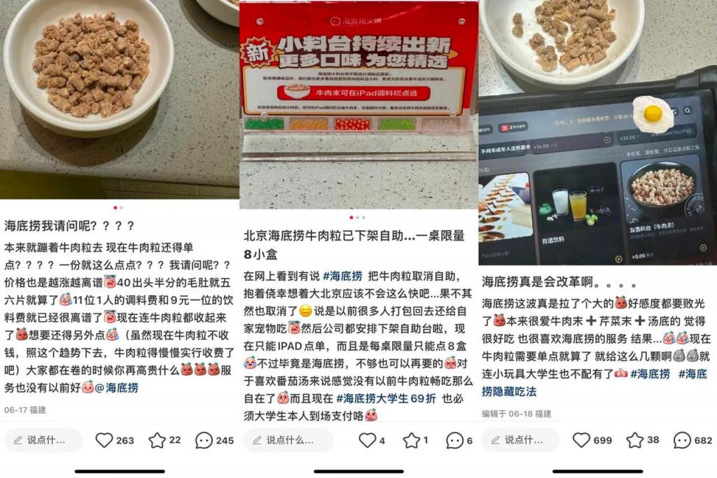 在以前,海底捞就曾对成本颇高的牛肉粒绞尽脑汁,除了尝试下架小料台外,一度尝试把牛肉粒替代成鸡肉粒,结果引来了消费者的一致不满,在众多非议后,才又舍得把牛肉粒加进了小料台。