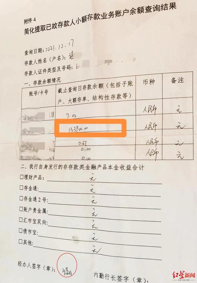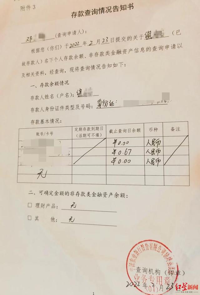 邓女士告诉红星新闻,2020 年 11 月,她拿着丈夫的死亡证明在中国农业银行平利支行查询到丈夫尾号 0072 的账户上存有 13 万多元。" 当时在他们要求下还开了查询回执单,12 月的时候我再去查询发现钱还在,他们当时还宽慰我‘钱跑不了,放心吧’。邓女士说。