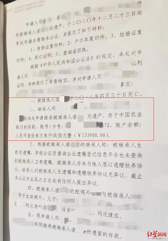 红星新闻记者查阅邓女士所提供的平利县公证处的(2020)陕安平证民字第 386 号公证书,邓女士提交了包括查询函回执的相关材料,公证处对材料进行了审查、核实,在查明相关事实的结论表述中,其中第二项是尾号 0072 的中国农业银行账户上余额:人民币壹拾叁万叁仟玖佰元整(¥133900.00)。该公证书的落款时间为 2020 年 12 月 23 日。