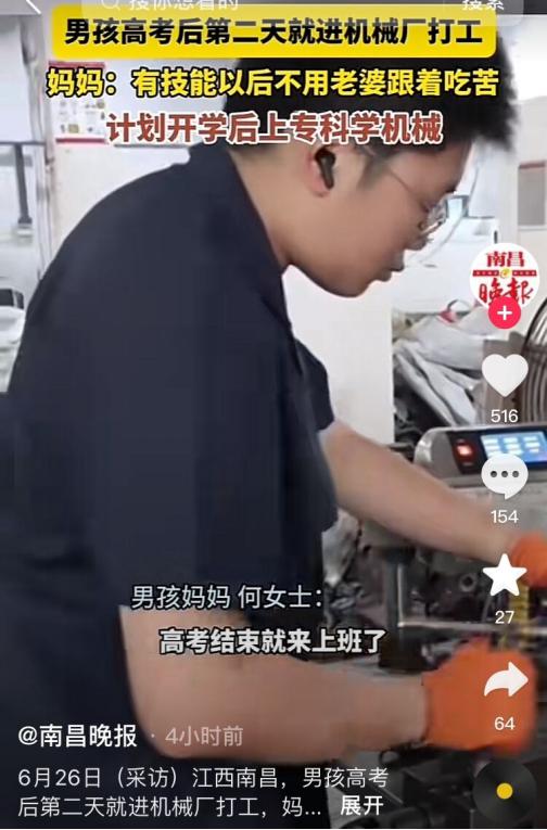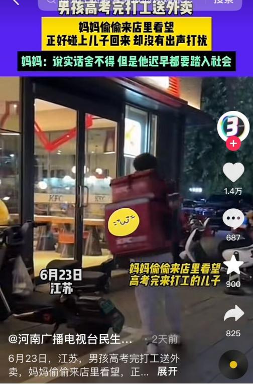 在江苏徐州,一位男生高考结束后选择做肯德基兼职外卖员,妈妈偷偷来店里探望时,看到男孩送餐归来,没有上前打扰。" 说实话舍不得,但他迟早要融入社会。" 妈妈说道。