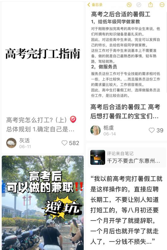 在一些社交平台上,不少考生分享出自己的暑假工攻略,水上乐园工作人员、夏令营生活老师、剧本杀 DM 也都成了热门选择。有的成功开辟了 " 准大学生遛狗 " 业务,有人在暑期做起带娃的工作,有人看中了保安、外卖员工作,决心去体验一番,当然,也有人继续着 " 传统 " 的小时工。此外,还有的网友发起了 " 足不出户,悄悄变富 " 的线上暑假工帖子,罗列了各种靠基本的资料收集、整理、手动整理数据等,就可以通过线上在这个暑假赚钱的方式。