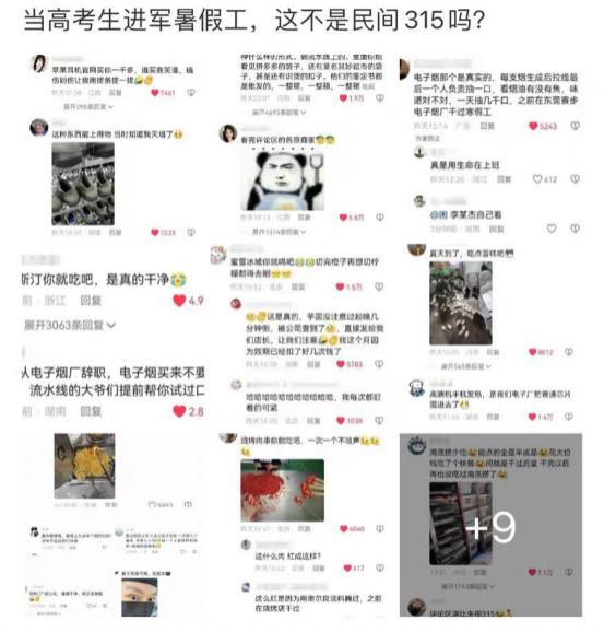 前几日,# 高考生暑假工 315# 这一词条登上热搜。事件最初,一位高考生爆出自己暑期打工工厂的食品原材料都堆放在地上,卫生条件堪忧。一条视频激起千层浪,越来越多的暑假工开始在评论区爆料,让人们不禁对这些企业的诚信和品质产生了深深的担忧,在微博等社交平台上还出现了网友们时时更新的企业红黑榜。这些年轻的暑假工们化身社会观察者,利用打工经历深入各行各业,揭露了部分企业存在的不良工作条件和食品安全隐患,并通过网络平台,将自己的所见所闻一一曝光,引起了广泛关注和讨论。网友评论:" 高考生进军暑假工,堪比央视 315。"