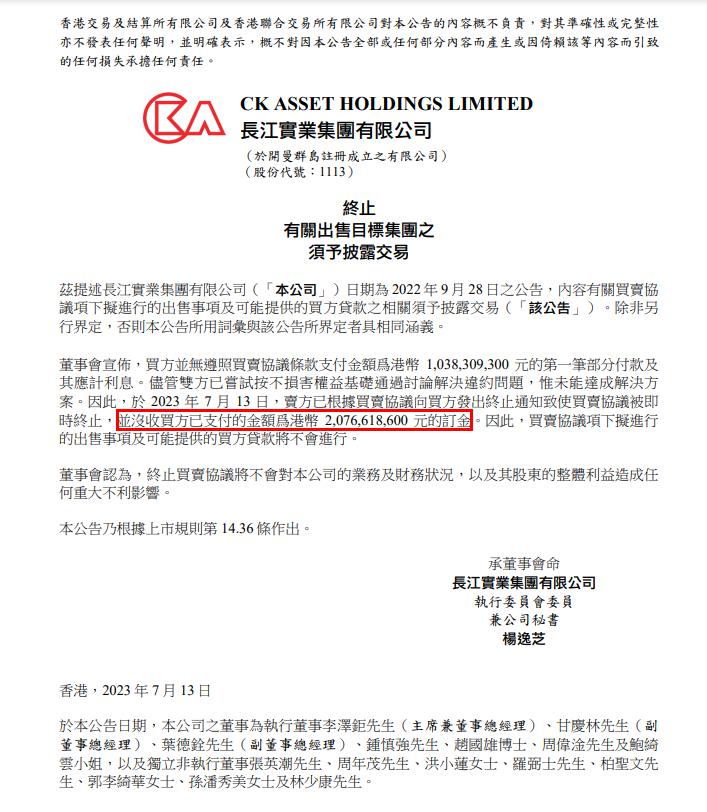 7 月 13 日,李嘉诚旗下长实集团(HK01113)发布公告称,终止出售位于香港波老道 21 号的物业发展项目 "21 BORRETT ROAD",并没收买方约 20.77 亿港元的订金。