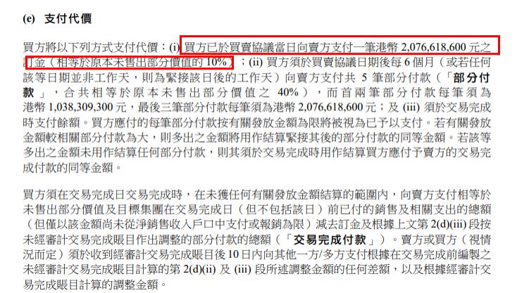 根据长实集团 2022 年 9 月 28 日公告,买方已于买卖协议当日支付约 20.77 亿港元(占总代价的 10%)的订金。此后,买方须于买卖协议日期后每 6 个月向卖方支付共 5 笔部分款项(共占总代价的 40%),其中前两笔部分付款每笔须为约 10.38 亿港元,后三笔部分付款每笔须为约 20.77 亿港元。最后于交易完成时支付余额。