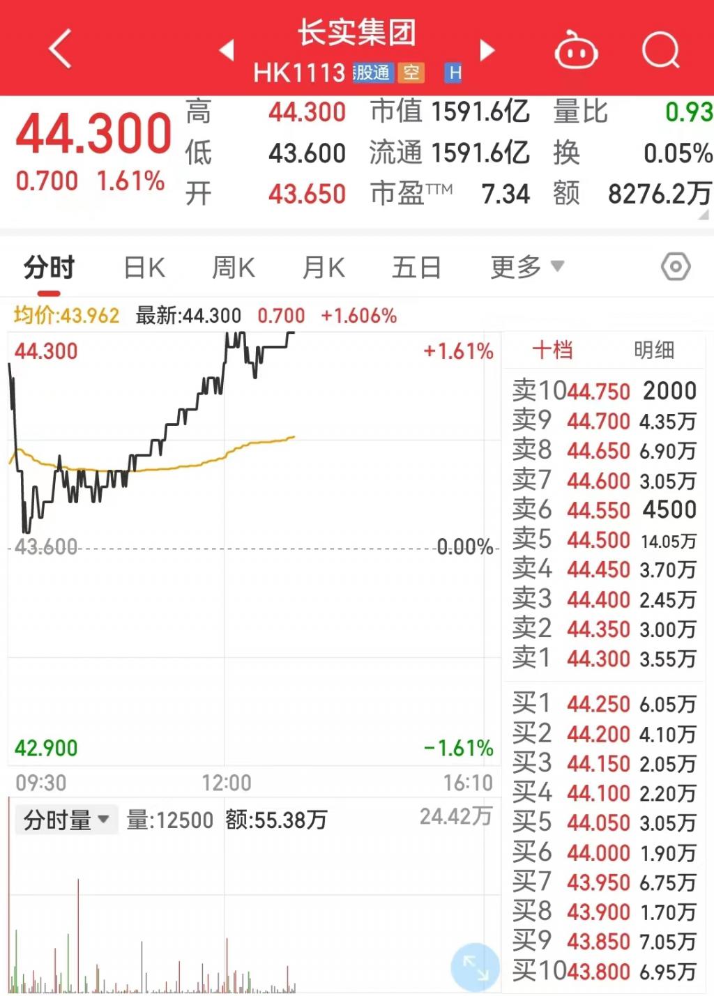 截至发稿,长实集团报 44.3 港元,涨幅 1.61%,市值 1591.6 亿港元。