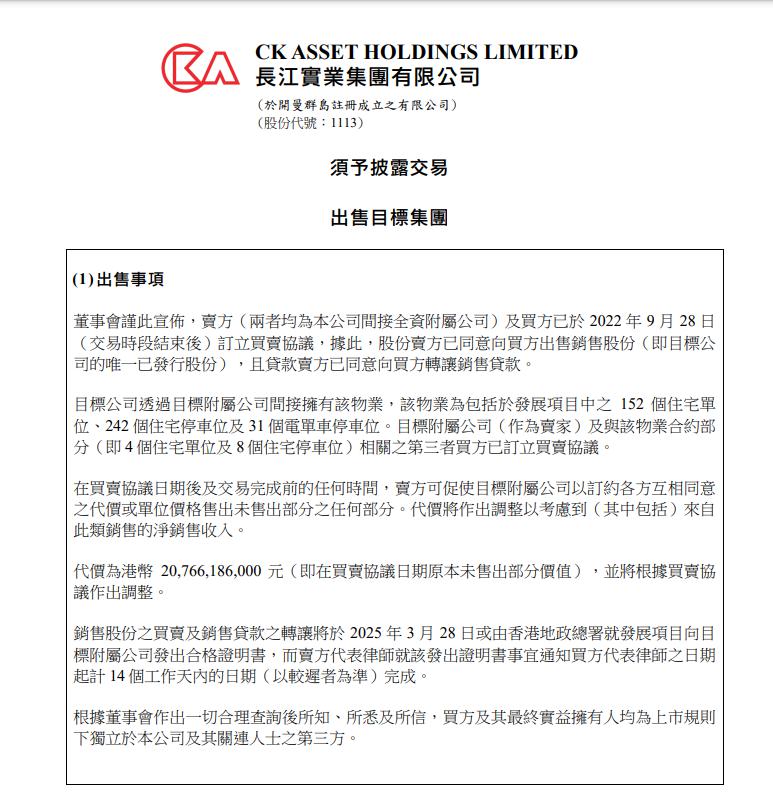 去年 9 月 28 日,长实集团宣布,卖方(两家长实集团间接全资附属公司)将 "21 BORRETT ROAD" 项目出售给新加坡公司 LC Vision Capital VCC 的子基金 LC Vision Capital 1,并由华瑞资本(Sino Suisse Capital Pte. Ltd.)管理。该项目包括 152 个住宅单位、242 个住宅停车位及 31 个电单车停车位,总代价约 207.66 亿港元。