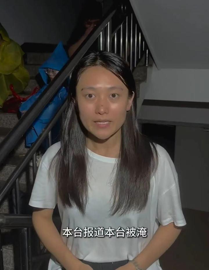 主持人陈怡心在楼梯间完成 " 本台报道本台被淹 " 报道。图源:中国记协微信公号