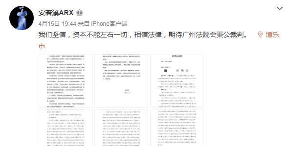 4月15日,安若溪在社交平台当中发布了一篇动态,称资本不能左右一切,相信法院会公平公正,最后又晒出了六张图片其中包含个人声明以及法院传票。