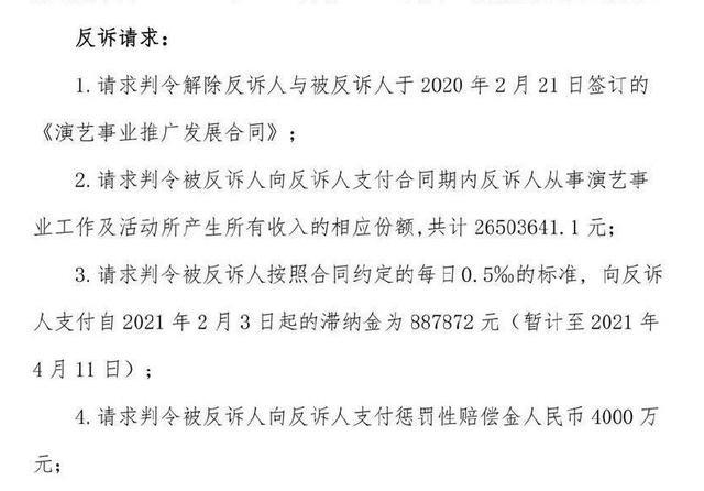 得知此事的安若溪立马进行了反诉程序,首先希望能够解除掉双方的合作关系,并且也希望公司能够支付自己工作期间的所有收入,大概在2700万左右,同时安若溪还要求辛巴方赔偿自己4000万人民币,总额为6700万。