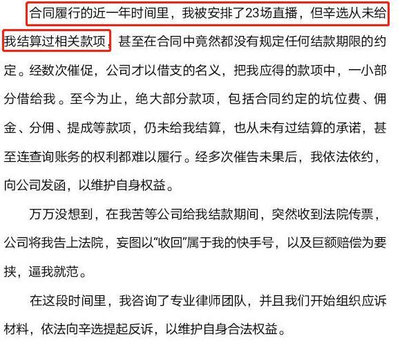 从声明中我们得知,安若溪在2019年时就被辛巴邀请多次,之后她决定正式加入辛选公司,2020年签约合同。这一年内,安若溪为辛巴进行了23场直播,公司却并没有给她结清所有款项,最后还是在她不断催促之下,公司以“借支”的名义给了她一小部分钱。