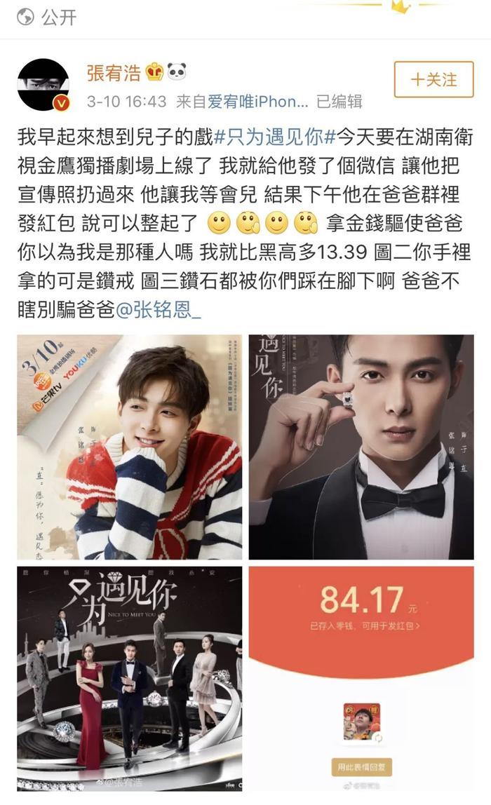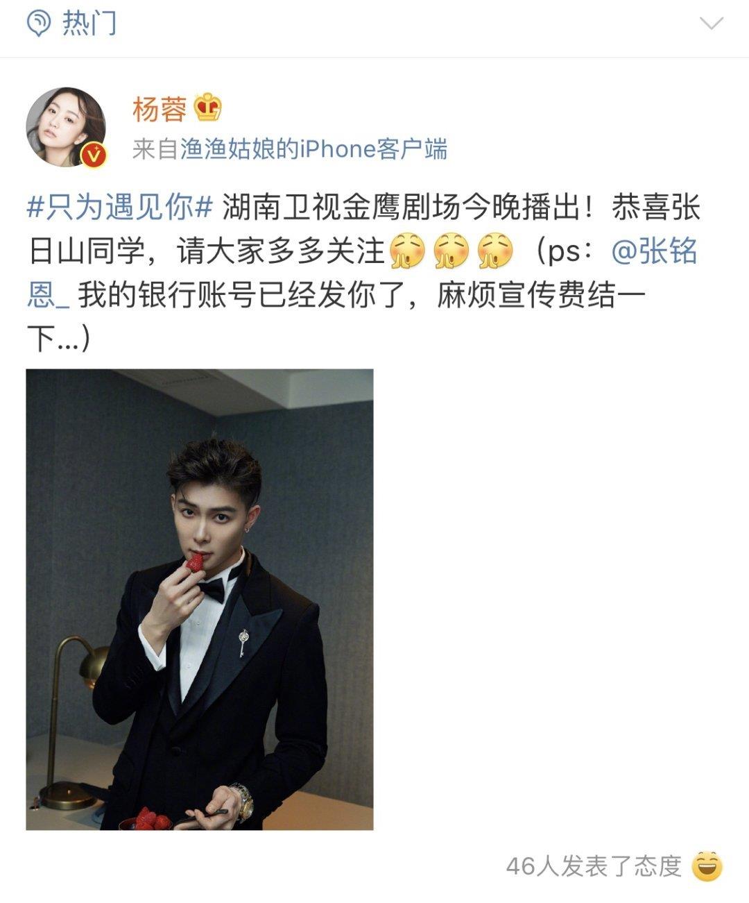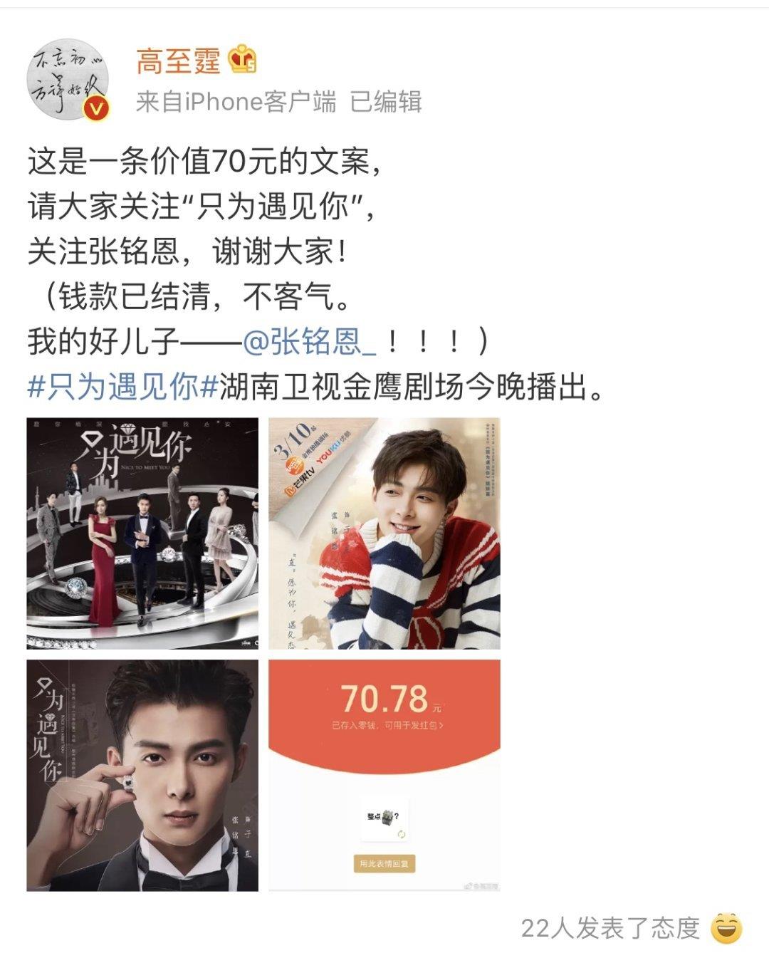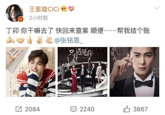屈楚萧、高至霆、张宥浩、杨蓉、王紫璇发微博为@张铭恩_ 新戏宣传并戏称宣传费结一下中戏四子的爸爸群里每天都聊啥呢也是很好奇了话已至此那么, 快来结账!!