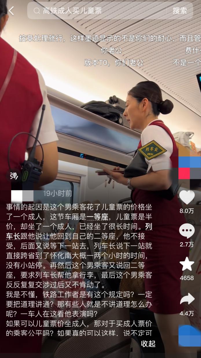视频发布者介绍,事情发生在 8 月 5 日,她乘坐 G72 次高铁列车从贵阳北上车。她刚上车就听到列车长正在和一名男子交涉。该男子坐的座位是一等座儿童半价票,列车长要求该男子回到二等座,但男子不肯回去,一直到下一站怀化南站才换回去。