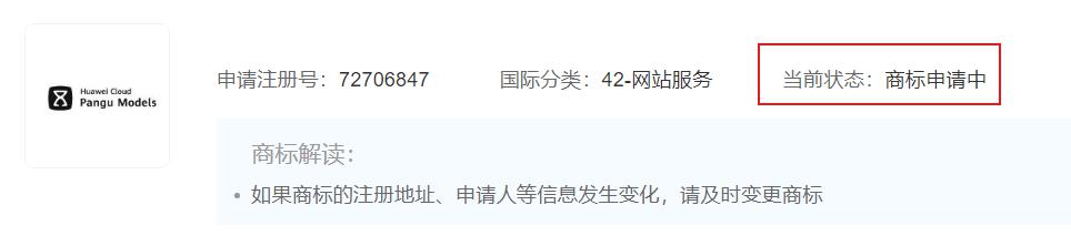芥末堆文 近日,华为技术有限公司申请注册 " 华为云盘古 ""Huawei Cloud Pangu Models" 文字及图形商标,国际分类为网站服务、社会服务,当前状态均为申请中。