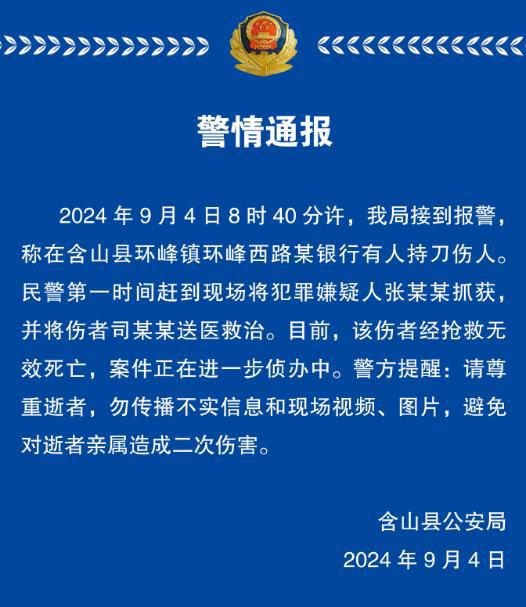 9 月 4 日 8 时 40 分许,我局接到报警称在含山县环峰镇环峰西路某银行有人持刀伤人。民警第一时间赶到现场将犯罪嫌疑人张某某抓获,并将伤者司某某送医救治。