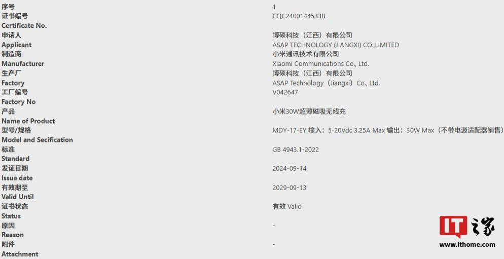 IT 之家注意到,小米 30W 超薄磁吸无线充已通过国内 CQC 认证,型号为 MDY-17-EY,支持 65W 输入和最大 30W 无线输出。