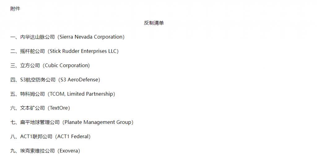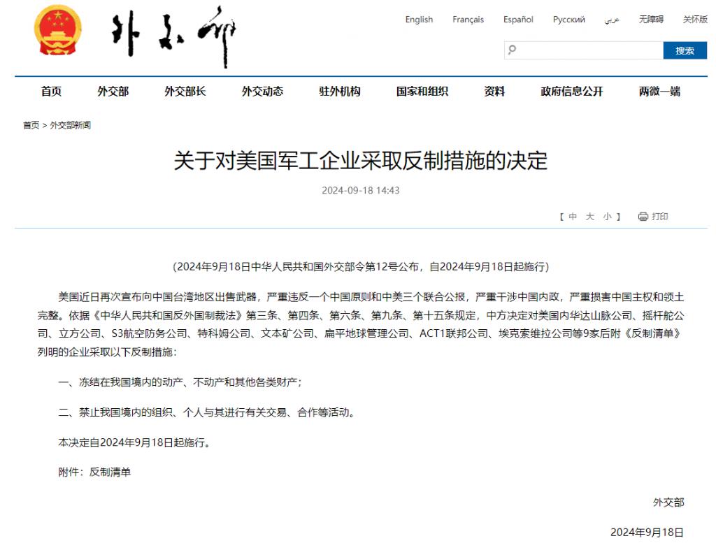财联社 9 月 18 日讯,外交部发布关于对美国军工企业采取反制措施的决定称,美国近日再次宣布向中国台湾地区出售武器,严重违反一个中国原则和中美三个联合公报,严重干涉中国内政,严重损害中国主权和领土完整。依据《中华人民共和国反外国制裁法》第三条、第四条、第六条、第九条、第十五条规定,中方决定对美国内华达山脉公司、摇杆舵公司、立方公司、S3 航空防务公司、特科姆公司、文本矿公司、扁平地球管理公司、ACT1 联邦公司、埃克索维拉公司等 9 家后附《反制清单》列明的企业采取以下反制措施: