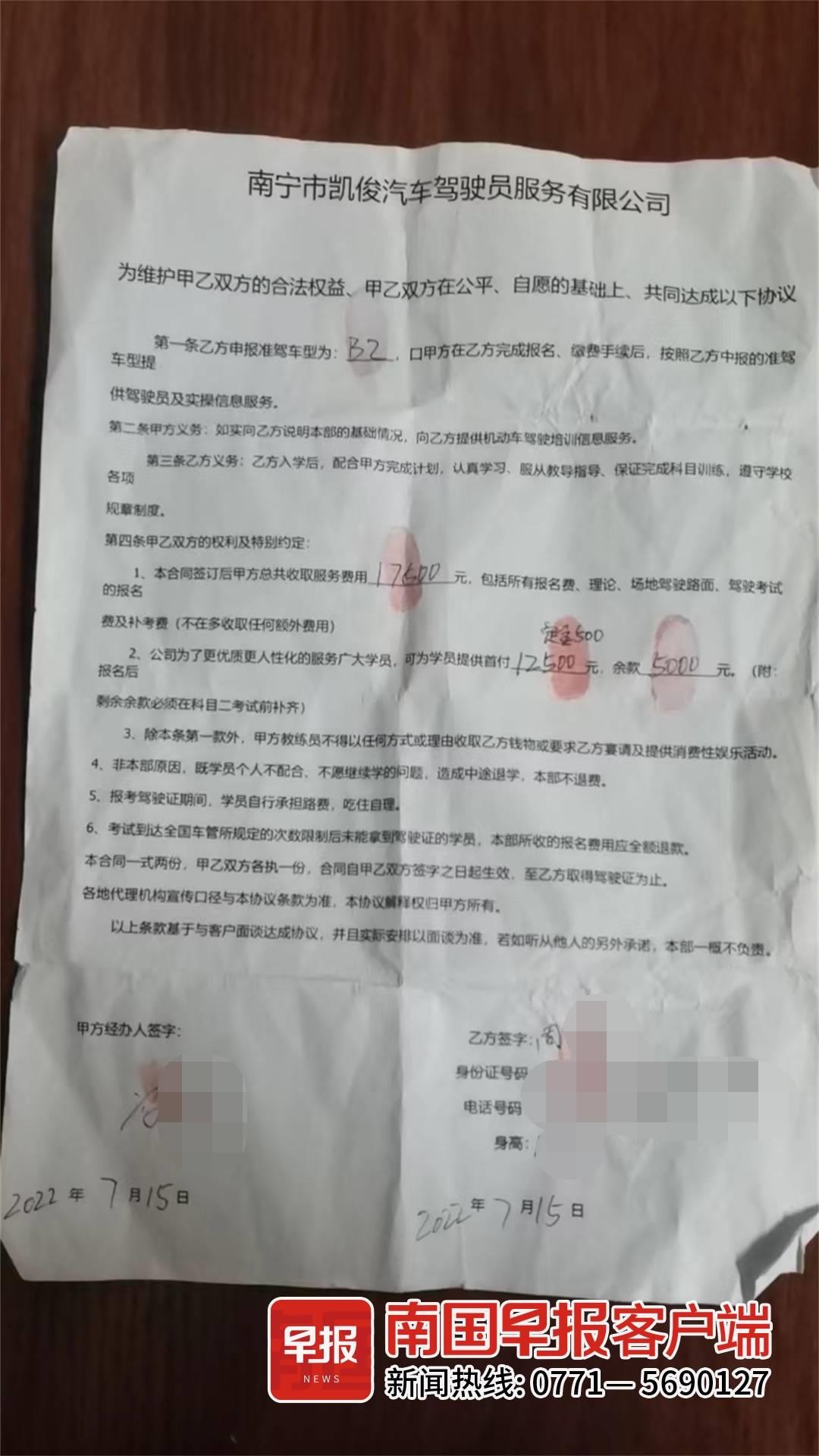 近日,有读者向南国早报客户端反映,因轻信他人在抖音发布的“驾考包过”广告,多名外地学员与南宁市凯俊驾驶员服务有限公司签订协议书,并预交5000元至上万元不等费用。学员交费后,发现该公司无培训资质,要求退钱未果。