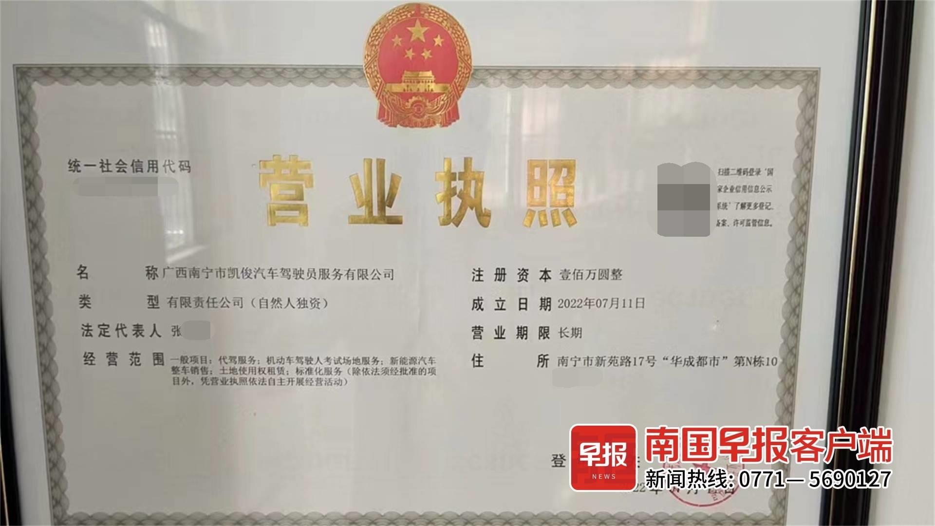 营业执照显示,该公司于今年7月11日成立,注册资本100万元,经营范围为:代驾服务、机动车驾驶人考试场地服务,并没有机动车驾驶员培训业务。