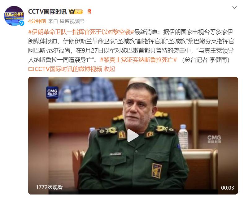 最新消息:据伊朗国家电视台等多家伊朗媒体报道,伊朗伊斯兰革命卫队 " 圣城旅 " 副指挥官兼 " 圣城旅 " 黎巴嫩分支指挥官阿巴斯 · 尼尔福尚,在 9 月 27 日以军对黎巴嫩首都贝鲁特的袭击中," 与真主党领导人纳斯鲁拉一同遭袭身亡 "。