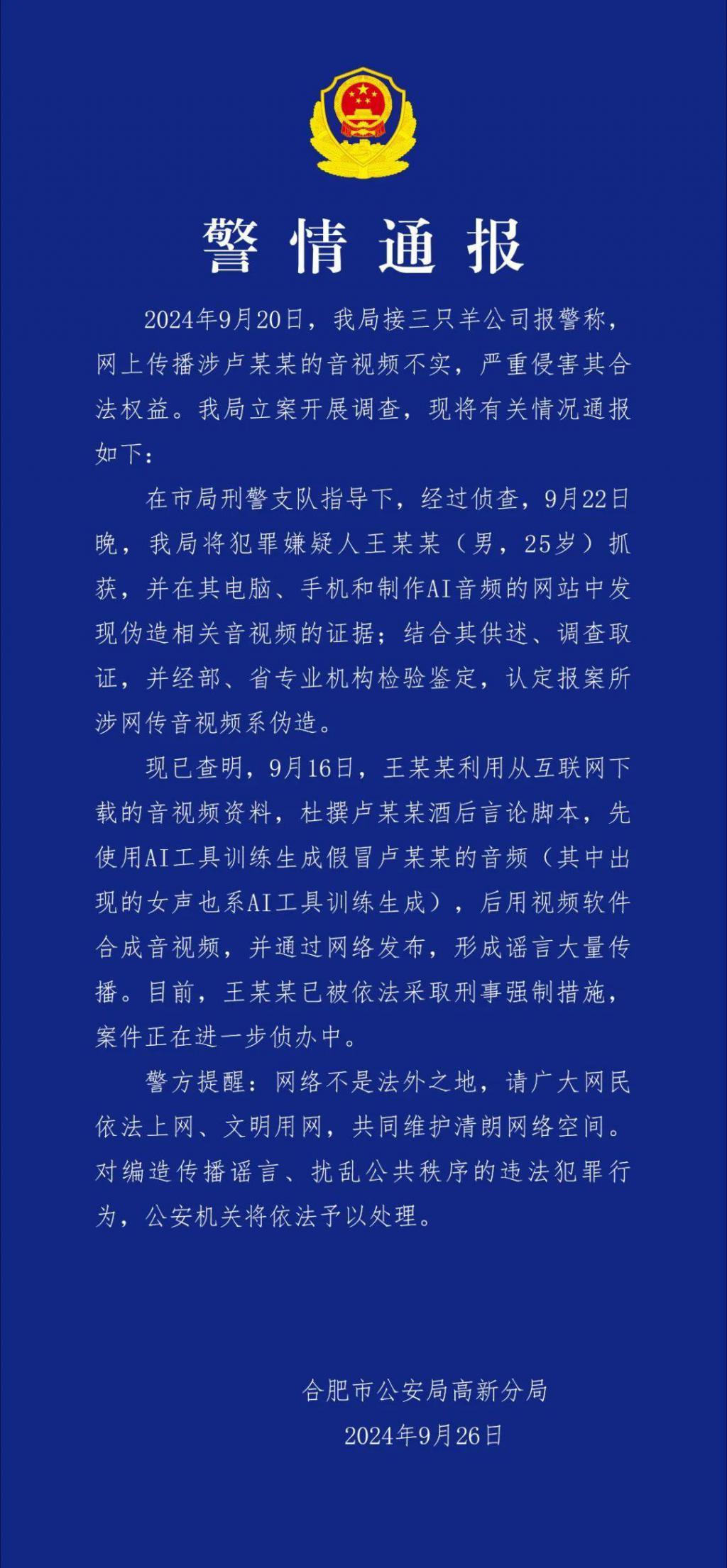 今日,合肥警方通报三只羊录音事件,卢某某音视频系 AI 合成,犯罪嫌疑人王某某(男,25 岁)被采取刑事强制措施,详情如下: