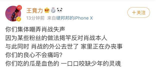 王竟力在肖战事件的最高潮发文称肖战的外公去世,称网友的行为是在一点点咬缺少年的灵魂。