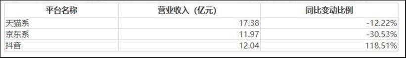具体来看,2021 年开始,三只松鼠来自天猫系和京东系的营收同时开始大幅下滑,到 2023 年,二者贡献的营收分别为 17.38 亿元、11.97 亿元;与此同时,抖音电商崛起,一定程度上弥补了公司在其它两大电商平台收入的损失。